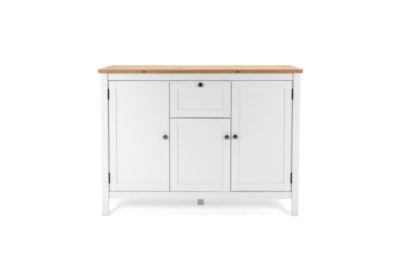 Finori Sideboard Bergen Weiß/Artisan EicheDie Bergen Möbelserie von Finori überzeugt mit ihren typischen hellen Farben des nordischen Stils. Das schlichte Weiß wird durch die warmen Akzente, die durch die Topplatten in heller Artisan-Eichen-Holzoptik gesetzt werden, optimal unterstrichen. Designgriffe aus Metall in Knopfform und Scharniere in Antik-Optik runden den Gesamteindruck perfekt ab. Mit diesen modernen Möbeln machen Sie Ihr Wohn- und Esszimmer zu Wohlfühlorten, an denen Sie sich gerne aufhalten. Das Sideboard der Serie bietet viel Platz, um Kleidung, Geschirr, Deko-Artikel oder sonstige Gegenstände zu verstauen. Material: Melaminbeschichtete Spanplatte (MDF), Kunststoff, Metall3x Tür, weiß1x Schublade, weiß4x Designgriff, Metall, Antik-OptikTüren mit Magnetverschluss5x Einlegeboden, weiß5x Füße, weißB/H/T: ca. 120x90x40 cmDie Ware wird zerlegt geliefert.