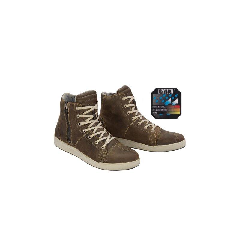 Der VOYAGER OILED DRYTECH ist ein multifunktionaler High-Tech-Sneaker für Motorrad, Roller, MTB, Fahrrad und Downhill im sportlichen Design mit optimalen Schutz. Um leichter in den Schuh zu gelangen, haben die Designer einem seitlichen Aussen-Reißverschluss verarbeitet, der beim bequemen An- und Ausziehen hilft. Die Schnürbänder dienen zur Optik und lassen den VOYAGER OILED DRYTECH wie einen gewöhnlicher Alltagsschuh erscheinen. Einer der Unterschiede zu einem normalen Schuh liegt im Inneren. Zum Schutz des Fußes befinden sich anatomisch vorgeformte Einsätze an den Außenseiten, die verhindern das die Fußknöchel und das Sprunggelenk bei einem Sturz beschädigt werden. Die Schutzfunktion des Schuhs wird durch eine Verstärkung im Bereich der Ferse ergänzt. Der Komfort des VOYAGER OILED DRYTECH wird durch ein atmungsaktives Innenmaterial, sowie rutschfesten Gummisohlen verbessert, die beim Gehen oder Laufen für die nötige Dämpfung sorgen. hochwertiges, strapazierfähiges geöltes Rinderleder DRYTECH Membran wasserdicht und atmungsaktiv doppelt vernähte Olli-Area Knöchel-Gel-Protektor Verstärkung im Fersenbereich Verschluss mit GAERNE-Aqua-Reißverschluß Schnürschuhoptik metallende Schnürsenkelösen atmungsaktives Innenfutter auswechselbares, anatomisch geformtes Fußbett rutschfeste, abriebfeste GAERNE-Sohle Sohle ist Öl- und benzinresistent Made in Italy Art. Nr.: 2948-013 Art. Bez: GAERNE VOYAGER OILED DRYTECH Größe: 41-47 Die GAERNE DRYTECH Membran ist eine polyurethane Klima-Membran. Die Membran wird zwischen das Außenmaterial und Futter eingearbeitet. Milliarden von Poren verhindern, dass große Regentropfen eindringen. Die kleinen Wasserdampfmolekühle der Körperfeuchtigkeit können jedoch entweichen. Es schützt vor Nässe und hält somit die Füße von außen und innen trocken und gleichzeitig rundherum warm. Komfortabel bei jedem Wetter.