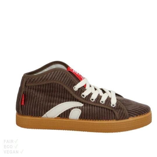 Taylor Cord Sneaker coffee Vegan Fair hergestellt Hergestellt in Spanien Mit Bio-Baumwolle und Gummi Die kaffebraunen veganen High Top Sneaker von Grand Step Shoes haben ein Obermaterial aus breit geripptem Cordstoff . Die 5 Loch Schuhe sind frei von tierischen Produkten und bieten durch die soften Sohlen einen hohen Tragekomfort. Die knöchelhohe Form und das auffällige Corddesign verleihen jedem Outfit das gewisse Extra. Obermaterial: Polyester. Innenmaterial: Bio-Baumwolle. Die Innensohlen sind aus einem Schaum auf Zuckerrohrbasis und mit Baumwolle beschichtet. Sohlen: Laufsohlen aus Gummi. Schaft/Absatz/Extras: Flache durchgehende Sohlen. Schafthöhe bei Größe 40 ca. 10,5cm. Die Innensohlen sind fest eingeklebt. Die Schnürsenkel sind aus recycelter Baumwolle und die Aufgenähten Etiketten aus recyceltem Polyester. Schuhpflege: Leicht zu pflegen. Einfach nur mit einer Bürste reinigen. Bei größeren Verschmutzungen mit einem in lauwarmem Wasser getränktem Lappen reinigen. Fair | Vegan | Ökologisch: Fair: Hergestellt in Spanien. Vegan: Alle verwendeten Materialien sind ohne tierische Inhaltsstoffe. Ökologisch: Aus Bio-Baumwolle und Gummi. Die Schuhkartons haben kurze Transportwege innerhalb Europas. Hergestellt in Spanien Spanien ist bekannt für eine qualitativ hochwertige Schuhproduktion. Die spanischen Schuhfabriken haben große Erfahrung mit der Herstellung von Schuhen. Die spanischen Schuhproduzent*innen legen viel Wert auf Nachhaltigkeit. Viele Fabriken verwenden umweltfreundliche Materialien und Produktionsmethoden und minimieren so die Umweltbelastung. Dies ist nicht nur gut für die Umwelt, sondern auch für die Menschen, da diese so nicht mit schädlichen Stoffen in Kontakt kommen . Auch die faire Bezahlung der Arbeiter*innen und die Arbeitsbedingungen werden hier großgeschrieben. Wer also auf der Suche nach qualitativ hochwertigen und nachhaltigen Schuhen ist, sollte sich Schuhe aus Spanien genauer anschauen. Grand Step Shoes Grand Step Shoes ist eine deutsche Schuhmarke, die für ihre hochwertigen und nachhaltigen Schuhe bekannt ist. Die Marke setzt auf innovative Materialien wie Apple Skin und natürliche Stoffe wie Baumwolle und Gummi. Verwendet werden ausschließlich umweltfreundliche Materialien und Produktionsmethoden. Dabei legt Grand Step Shoes besonderen Wert auf eine faire Arbeitsbedingungen und die Einhaltung sozialer Standards. Mit ihrem modernen und dennoch zeitlosen Design sprechen die Schuhe von Grand Step Shoes eine breite Zielgruppe an und bieten eine nachhaltige Alternative für Modebewusste, die auf Qualität achten und umweltbewusst sind.