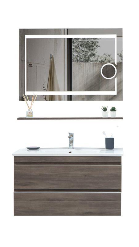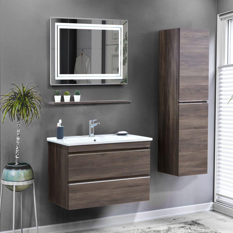 Trend Badmöbel Kombi mit Waschtisch und Spiegel 85 cm Sie haben ihr Badezimmer neu eingerichtet und es fehlt nur noch das passende Waschbecken mit Spiegel oder es ist mal Zeit das Gäste-WC zu modernisieren? Dann könnte diese Badmöbel Kombi genau das Richtige für Sie sein. Die Trend Serie von Martat überzeugt mit einem modernen, schnörkellosen Design. Sie braucht keine komplizierten Farbkompositionen, sondern findet Ausdruckskraft in der Schlichtheit der dunklen Eichenoptik. Highlights werden clever gesetzt und kommen auch, wie zum Beispiel bei den Spiegeln, nicht ohne praktischen Nutzen. Mit dieser Kombi erhalten Sie einen Waschtisch mit Keramik-Waschbecken, ein kleines Wandregal und einen Spiegel mit integriertem LED-Licht. Der Spiegel hat eine Maße von 80x70 cm, mit rechteckig angeordneten LEDs. Auf dem kleinen Wandregal können zum Beispiel Zahnbürste und Co., oder auch ein bisschen Deko, Platz finden. Handtücher, Hygieneartikel, etc. finden ihren Platz in den beiden Schubladen des Waschtisches. Die Griffe für die Schubladen sind in die Kanten eingefügt und sorgen, mit ein bisschen Chrom, für den einzigen, kleinen Farbakzent der Trend Möbel. Das Waschbecken ist in den Waschtisch integriert. Es hat eine moderne Form und wird aus Keramik hergestellt. Ein Wasserhahn ist im Lieferumfang nicht enthalten. Sollte die Trend Serie doch nicht ganz das Richtige sein, finden Sie in unserem Online-Shop eine große Auswahl an anderen Badezimmermöbeln. 1x Waschtisch Trend 85 Material: melaminbeschichtetes MDF, Keramik Keramik-Waschbecken 2x Schublade, integrierter GriffMit WandregalB/H/T: ca. 85x55x45 cm1x Wandspiegel Trend 85 RechteckigMit LED-LeuchteB/H: ca. 80x70 cmDie Ware wird aufgebaut geliefert.