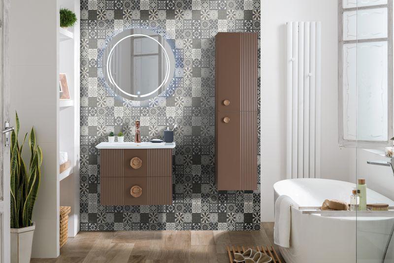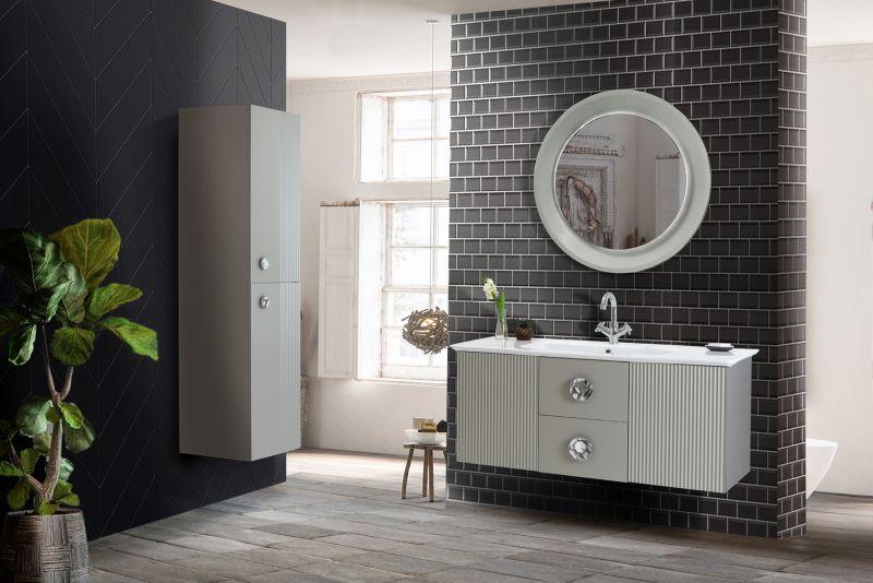 Vanity 70 Badmöbel Set 3-teilig Retro Grau SilberMit dem Vanity Badmöbel Set holen Sie sich Eleganz, mit einem charmanten Retro-Touch, in Ihr Badezimmer. Die Vanity Serie von Martat besticht durch eine stilvolle Farbauswahl, edle Schubladen-/Türgriffe und praktische Spiegel. Neben den Griffen sorgen auch die geriffelten Türen, die mit CNC-Technologie eingraviert werden, für einen Retro-Look. Dieses Set enthält einen 70cm breiten Waschtisch mit Waschbecken, einen hängenden Hochschrank und einen runden Spiegel mit integrierter LED. Die schmalen Möbel machen dieses Set perfekt als Einrichtung für ein Gäste-WC. Der Spiegel hat eine klassische Kreisform, die LED-Halbkreise lassen sich mit einem kleinen Knopf im Spiegel ein- und ausschalten. Handtücher, Hygieneartikel, etc. lassen sich in dem Hochschrank und dem Waschtisch verstauen. Sowohl die beiden Türen des Hochschranks, als auch die Schubladen des Waschtisches, sind mit den eleganten, silbernen Griffen ausgestattet und in mattem Grau lackiert. Das Waschbecken ist in den Waschtisch integriert und wird aus Keramik hergestellt. Ein Wasserhahn ist im Lieferumfang nicht enthalten. In unserem Online-Shop können Sie auch andere Modelle der Vanity Serie finden.1x Waschtisch Vanity 70 GrauMaterial: MDF, KeramikMit Waschbecken2x Schublade2x Griff, SilberB/H/T: ca. 70x50x47 cm1x Hochschrank Vanity GrauMaterial: MDF2x Tür2x Griff, SilberB/H/T: ca. 35x140x35 cm1x Wandspiegel Vanity 70 SmartKreisförmigMit LED-KreisB/H: ca. 70x70 cmDie Ware wird aufgebaut geliefert.
