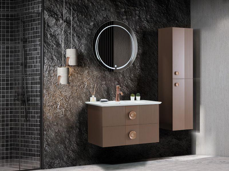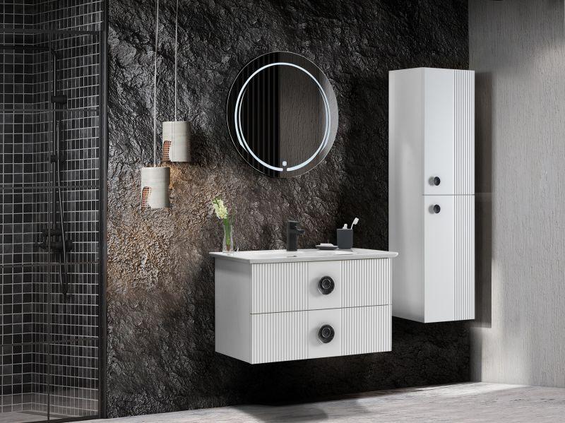 Vanity 90 Badmöbel Set 3-teilig Retro Grau SilberMit dem Vanity Badmöbel Set holen Sie sich Eleganz, mit einem charmanten Retro-Touch, in Ihr Badezimmer. Die Vanity Serie von Martat besticht durch eine stilvolle Farbauswahl, edle Schubladen-/Türgriffe und praktische Spiegel. Neben den Griffen sorgen auch die geriffelten Türen, die mit CNC-Technologie eingraviert werden, für einen Retro-Look. Dieses Set enthält einen 90cm breiten Waschtisch mit Waschbecken, einen hängenden Hochschrank und einen runden Spiegel mit integrierter LED. Die schmalen Möbel machen dieses Set perfekt als Einrichtung für ein Gäste-WC. Der Spiegel hat eine klassische Kreisform, die LED-Halbkreise lassen sich mit einem kleinen Knopf im Spiegel ein- und ausschalten. Handtücher, Hygieneartikel, etc. lassen sich in dem Hochschrank und dem Waschtisch verstauen. Sowohl die beiden Türen des Hochschranks, als auch die Schubladen des Waschtisches, sind mit den eleganten, silberne Griffen ausgestattet und in mattem Grau lackiert. Das Waschbecken ist in den Waschtisch integriert und wird aus Keramik hergestellt. Ein Wasserhahn ist im Lieferumfang nicht enthalten. In unserem Online-Shop können Sie auch andere Modelle der Vanity Serie finden.1x Waschtisch Vanity 90 GrauMaterial: MDF, KeramikMit Waschbecken2x Schublade2x Griff, SilberB/H/T: ca. 90x50x47 cm1x Hochschrank Vanity GrauMaterial: MDF2x Tür2x Griff, SilberB/H/T: ca. 35x140x35 cm1x Wandspiegel Vanity 90 SmartKreisförmigMit LED-KreisB/H: ca. 80x80 cmDie Ware wird aufgebaut geliefert.