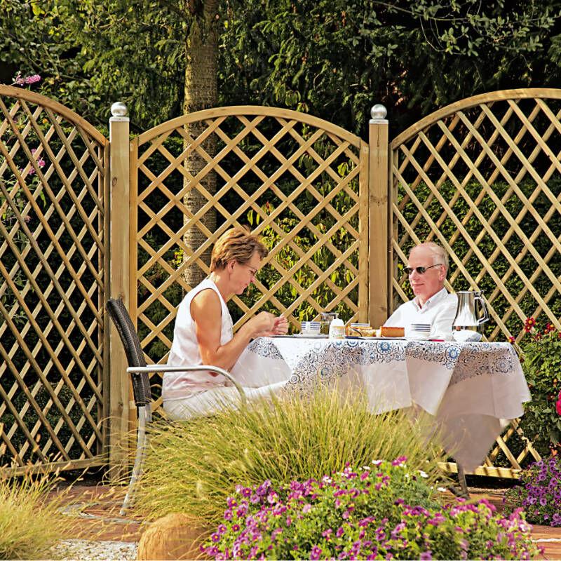 Bogen Rankzaun Der Bogen Rankzaun ist aus vorbehandelter Kiefer/Fichte gefertigt und hat einen Bogen als oberen Abschluss. Der Rahmen hat ein Maß von 45 x 45 mm und die geriffelten Rankstäbe von 12 x 30 mm. Der Rahmen und die Rankstäbe sind verzinkt geklammert. Der Rankzaun hat eine Maschenweite von 6 x 6 cm und ein Gesamtmaß von 180 x 180/160 cm. Technische Daten: aus Kiefer/Fichte 180 x 180/160 cm Diagonal Bogen Rahmen 45 x 45 mm Rankstäbe 12 x 30 mm geriffelt Maschenweite 6 x 6 cm