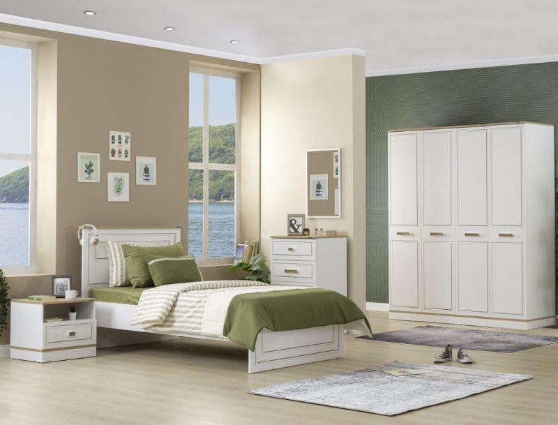 Ritmik Jugendzimmer Komplettset Rixos 6-teilig 100x200 cmDie Rixos Serie von Ritmik überzeugt mit ihrem schlichten Weiß und den elegant designten Fronten, deren Profil mit Laser gebrannt wurde. Ein besonderer Akzent wird durch die Boden- und Kopfplatten in heller Holz-Optik gesetzt. Schaffen Sie Ihrem Nachwuchs mit diesem Möbelset einen stilvollen Raum in modernem Design, für optimale Entspannung und Erholung, in dem er sich wohlfühlen kann. Ein nützliches Feature sind die Lüftungskapseln im Kleiderschrank. Bei diesem Set können Sie als Bettbreite 100 cm oder 120 cm, sowie einen 3-, oder 4-türigen Kleiderschrank auswählen. Dieses 6-teilige Set enthält das Bett, einen Kleiderschrank, den Schreibtisch mit enthaltenem Organizer-Aufsatz, den Nachttisch, die Schubladenkommode mit optional erhältlichem Wandspiegel und das Bücherregal. Alle Teile dieser Serie sind auch einzeln erhältlich, sodass Sie Ihr Kinder-, bzw. Jugendzimmer ganz nach Ihren Wünschen selbst zusammenstellen können. 1x Einzelbett Rixos 100x200 cm, weiß, helle Holz-OptikMaterial: Metall, melaminbeschichtete SpanplatteInkl. Bettgestell aus Metall (Metallgitter), (dient als Lattenrost)Ohne Matratze (optional erhältlich)Ohne Bettkasten (optional erhältlich)Obere Abschlussleisten an Kopf- und Fußteil in heller Holz-OptikLiegefläche: 100x200 cmB/H/T: ca. 113x106x208 cm1x Kleiderschrank Rixos 3-türig, weiß, helle Holz-OptikMaterial: Melaminbeschichtete Spanplatte3x Tür, weiß3x Designgriff, Holz-Optik4x Einlegeboden, schmal, weiß2x Einlegeboden, breit, weiß1x Kleiderstange, breit2x LüftungskapselSoft-Close-MechanismusKopf- und Bodenplatte in heller Holz-OptikB/H/T: ca. 135x209x60 cm1x Schreibtisch Rixos mit Organizer-Aufsatz, weiß, helle Holz-OptikMaterial: Melaminbeschichtete Spanplatte1x Schublade mit zwei abgeteilten Fächern, weiß1x Tür, weiß1x Designgriff, helle Holz-OptikSoft-Close-Mechanismus3x kleines Fach und 1x großes Fach im Organizer-AufsatzSchreibtischplatte und Regalplatten in heller Holz-OptikSchreibtischstuhl Loft nicht enthalten (optional erhältlich)B/H/T: ca. 120x120x60 cm1x Nachttisch Rixos, weiß, helle Holz-OptikMaterial: Melaminbeschichtete Spanplatte1x Schublade, weiß1x Designgriff, helle Holz-Optik1x offenes Fach, weißSoft-Close-MechanismusKopf- und Bodenplatte in heller Holz-OptikB/H/T: ca. 45x47x47 cm1x Schubladenkommode Rixos mit optionalem Wandspiegel, weiß, helle Holz-OptikMaterial: Melaminbeschichtete Spanplatte4x Schublade, weiß4x Designgriff, helle Holz-OptikSoft-Close-MechanismusKopf- und Bodenplatte in heller Holz-OptikWandspiegel nicht enthalten (optional erhältlich)B/H/T: ca. 60x95x48 cm1x Bücherregal Rixos, weiß, helle Holz-OptikMaterial: Melaminbeschichtete Spanplatte1x Schublade, weiß1x Designgriff, helle Holz-OptikSoft-Close-Mechanismus3x Einlegeboden, schmal, weißKopf- und Bodenplatte in heller Holz-OptikB/H/T: ca. 60x160x38 cmOptional erhältlich:1x Aktiva 7-Zonen-Kaltschaummatratze 100x200 cm1x Bettkasten Rixos 90x190 (B/H/T: 200x24x97 cm)1x Aktiva 7 Zonen Kaltschaummatratze 90x190 1x Schreibtischstuhl Loft, weiß1x Wandspiegel Rixos (B/H/T/: 44x69x3 cm)Die Ware wird zerlegt geliefert.