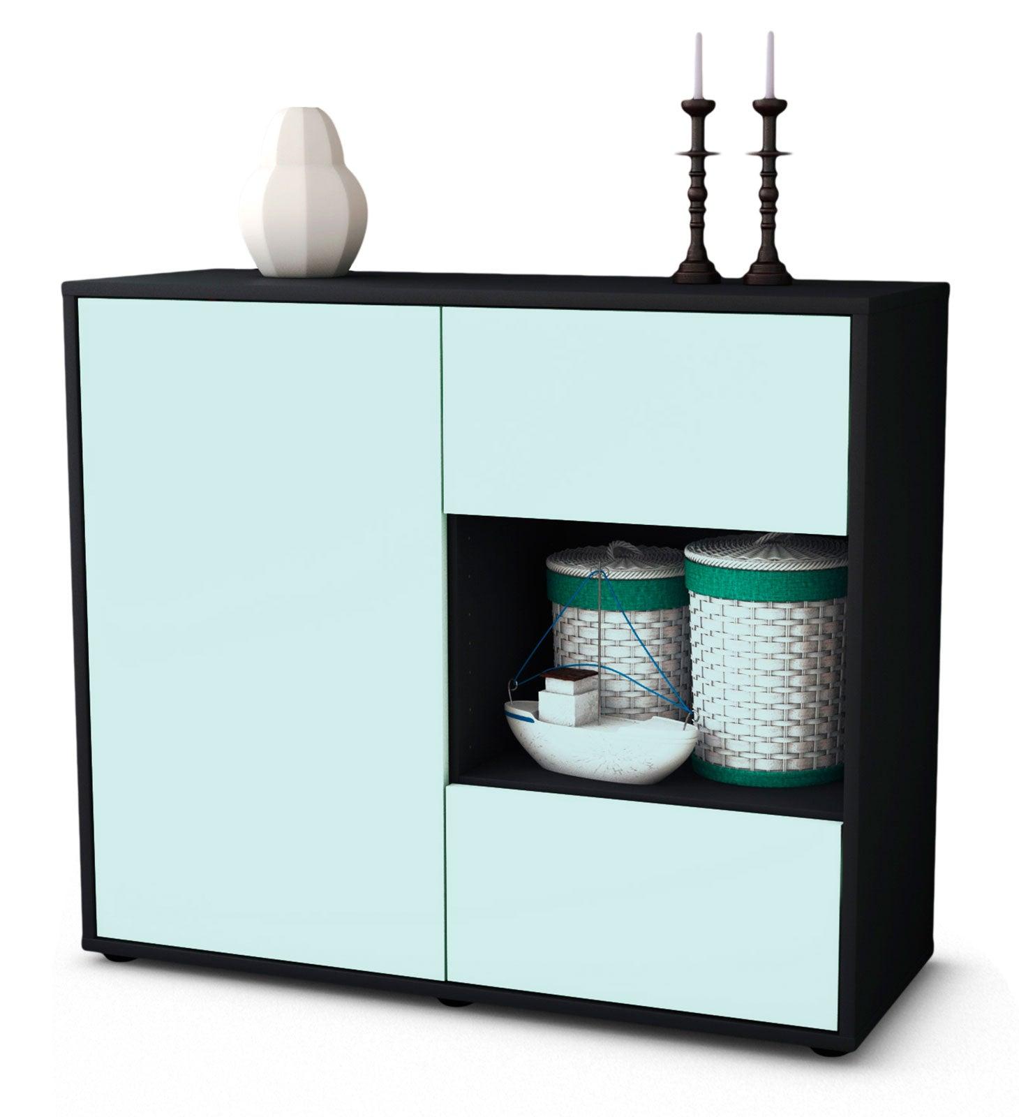 Dieses Sideboard hat Gesamt-Maße von 92x79x35cm. Viel Platz, eine leere Wand, kein passendes Möbelstück? Unsere 92 cm lange Kommode ist die perfekte Lösung! Die Frontfarbe Eisblau verleiht Ihrem Raum Frische. Das Himmelblau fördert eine sanfte Atmosphäre. Die Farben Hellblau und Mint werden gerne für moderne Wohnräume verwendet. Der weiße matte Korpus kann überall integriert werden. Mit der beruhigenden Farbe weiß, findet sich leicht Stellplatz für dieses schöne Möbelstück.