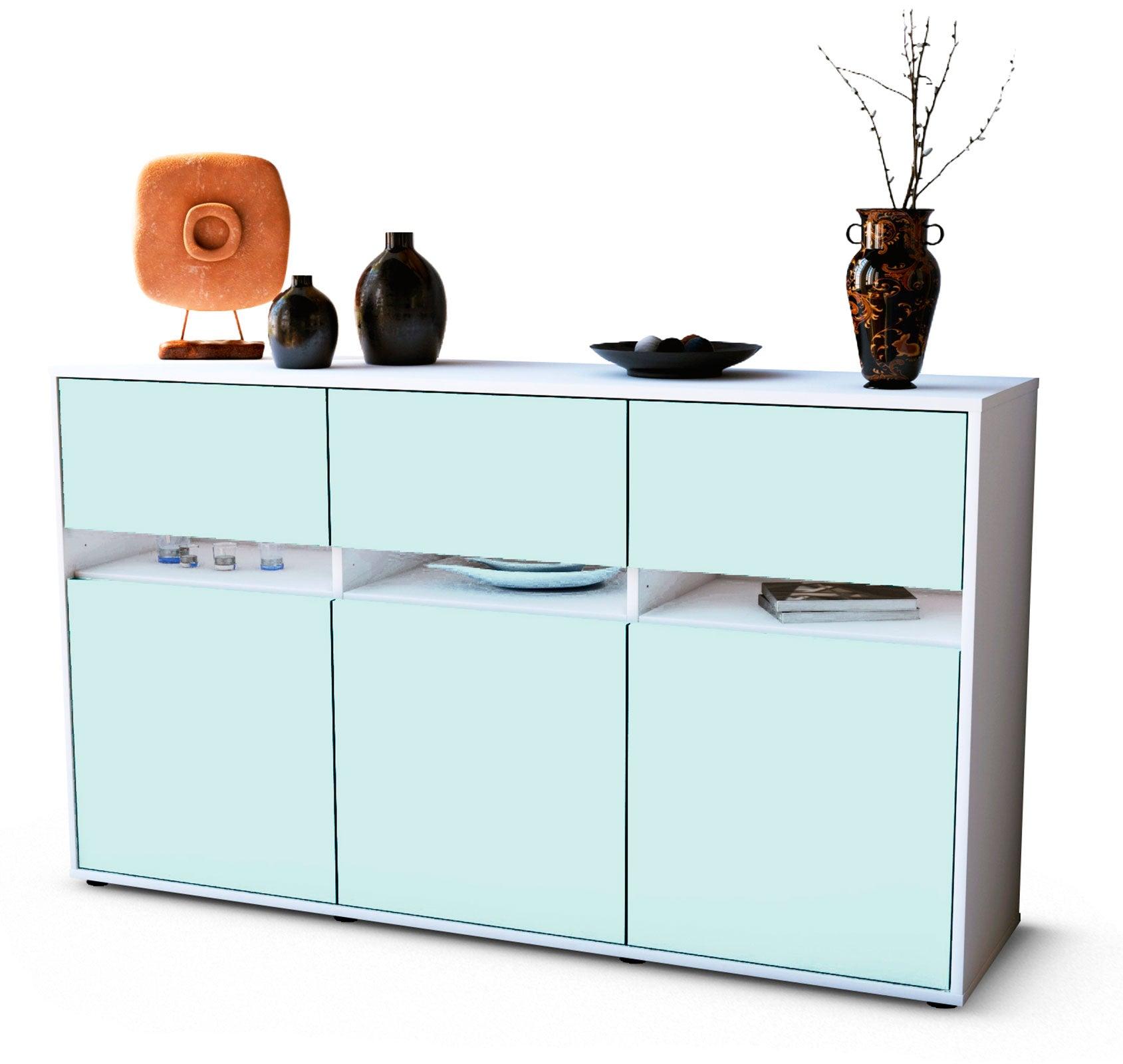 Dieses Sideboard hat Gesamt-Maße von 136x79x35cm. Viel Platz, eine leere Wand, kein passendes Möbelstück? Unsere 1,36 m lange Kommode ist die perfekte Lösung! Die Frontfarbe Eisblau verleiht Ihrem Raum Frische. Das Himmelblau fördert eine sanfte Atmosphäre. Die Farben Hellblau und Mint werden gerne für moderne Wohnräume verwendet. Der anthrazit-matte Korpus harmoniert mit allen Farben und wirkt besonders edel im Kontrast zu hellen Wänden.