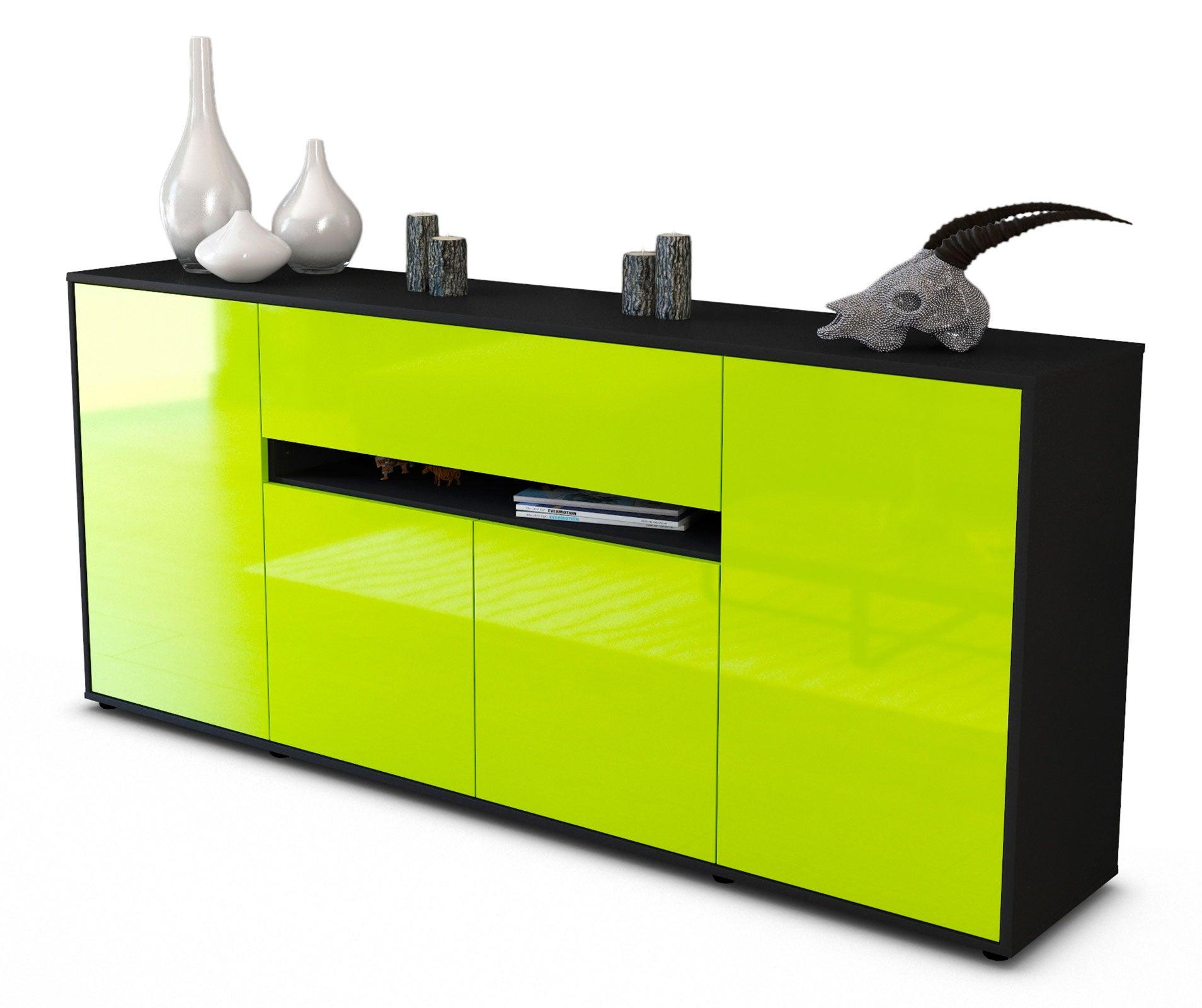 Dieses Sideboard hat Gesamt-Maße von 180x79x35cm. Viel Platz, eine leere Wand, kein passendes Möbelstück? Unsere 1,80 m lange Kommode ist die perfekte Lösung! Die Frontfarbe Hochglanz Limettengrün bringt Schwung, Glanz und Farbe in jede Wohnung. Das knallig, leuchtende grün ist glänzend und wirkt wie ein frisches Apfelgrün oder eine saftige Limette. Der weiße matte Korpus kann überall integriert werden. Mit der beruhigenden Farbe weiß, findet sich leicht Stellplatz für dieses schöne Möbelstück.