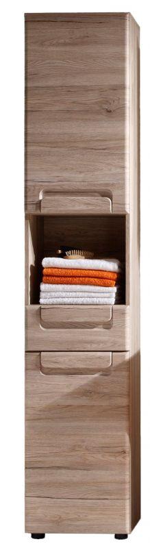 Badezimmer Hochschrank Runner 2-türig helle Eiche Optik Dank des edlen und zeitlosen Designs ist der Badezimmer Hochschrank Runner in schlichter Eiche Optik ein echter Blickfang für Ihr Badezimmer. Dadurch lässt sich dieser attraktive Standschrank wunderbar vielseitig kombinieren und passt sich jedem Raumkonzept an. Daneben bietet Ihnen der Badezimmer Schrank Runner viel Stauraum für Badetücher, Kosmetikartikel oder auch Putzmittel. Hinter seinen beiden Türen befinden sich jeweils zwei Fächer, zwei weitere offene Fächer dazwischen. So ist auf jeden Fall für die Ordnung im Badezimmer gesorgt. Auch lässt er sich in jeder Wohnung leicht und unkompliziert integrieren. Der Standschrank Runner wird zu einem tollen Hingucker im Badezimmer. Sie können den Schrank Runner mit dem Waschbeckenunterschrank und dem Wandspiegel aus dieser Serie kombinieren, so wird ein wundervolles Badezimmer Set daraus für Ihre Wohnung. Weitere Elemente dieser Serie finden Sie unter der Produktbeschreibung und in unserem Online-Shop.Material: Melamin, beschichtet2x Türe2x offenes Fach 3x EinlegebodenB/H/T: ca. 30x190x31 cm Die Ware wird zerlegt geliefert.